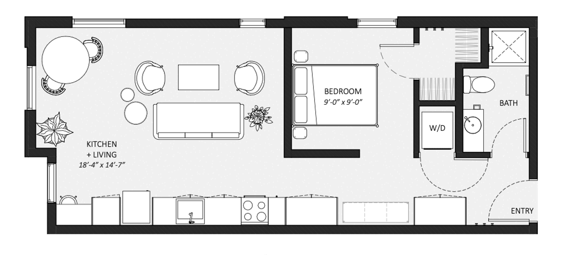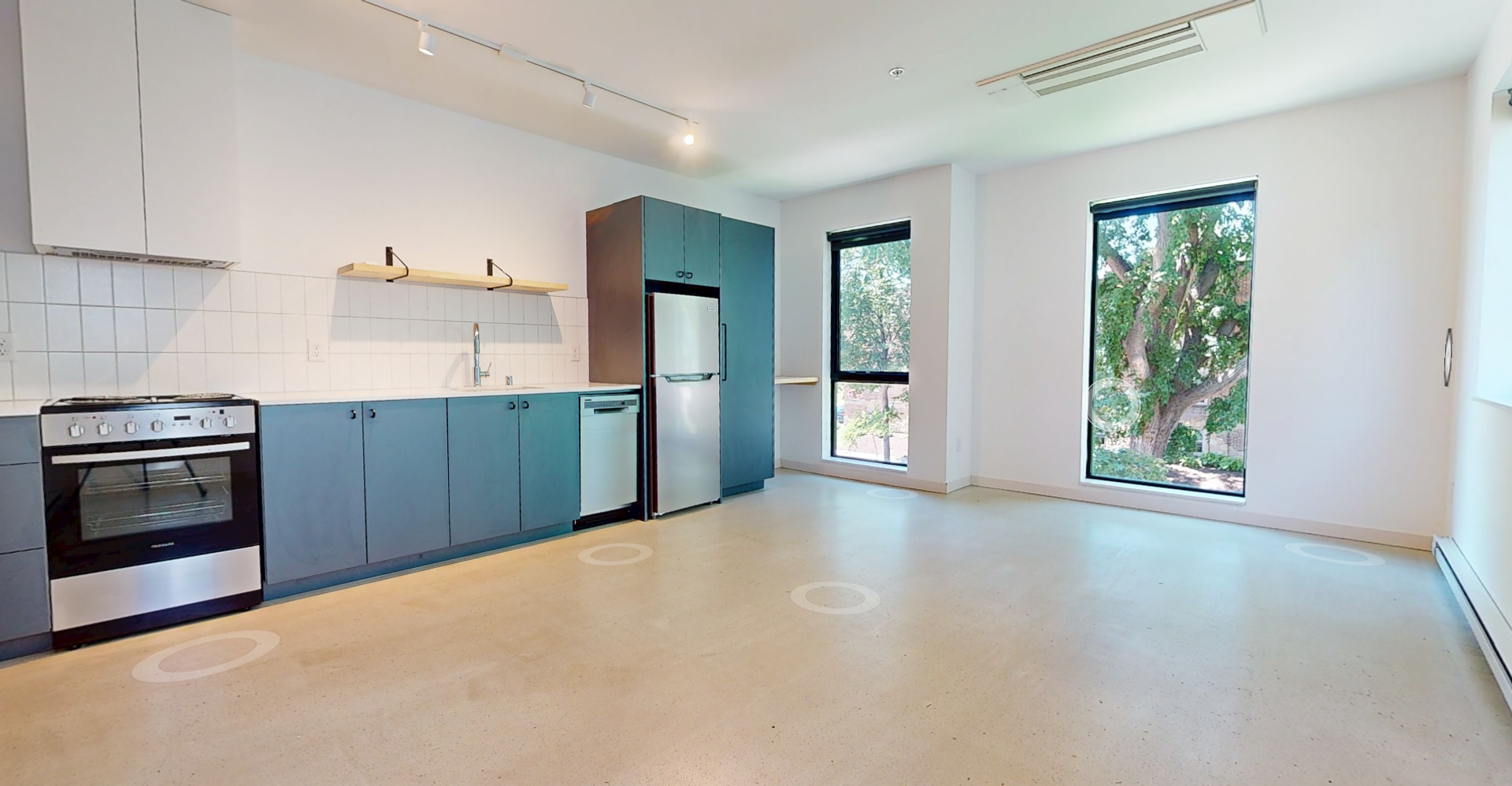 This stunning condo-style 1BR features high-end finishes, including polished concreate flooring, creating a warm and inviting ambiance. The open-concept kitchen boasts energy-efficient stainless steel appliances and sleek quartz countertops, perfect for home chefs and entertainers alike. Expansive large windows flood the space with natural light, enhancing the airy, sophisticated feel of the home.