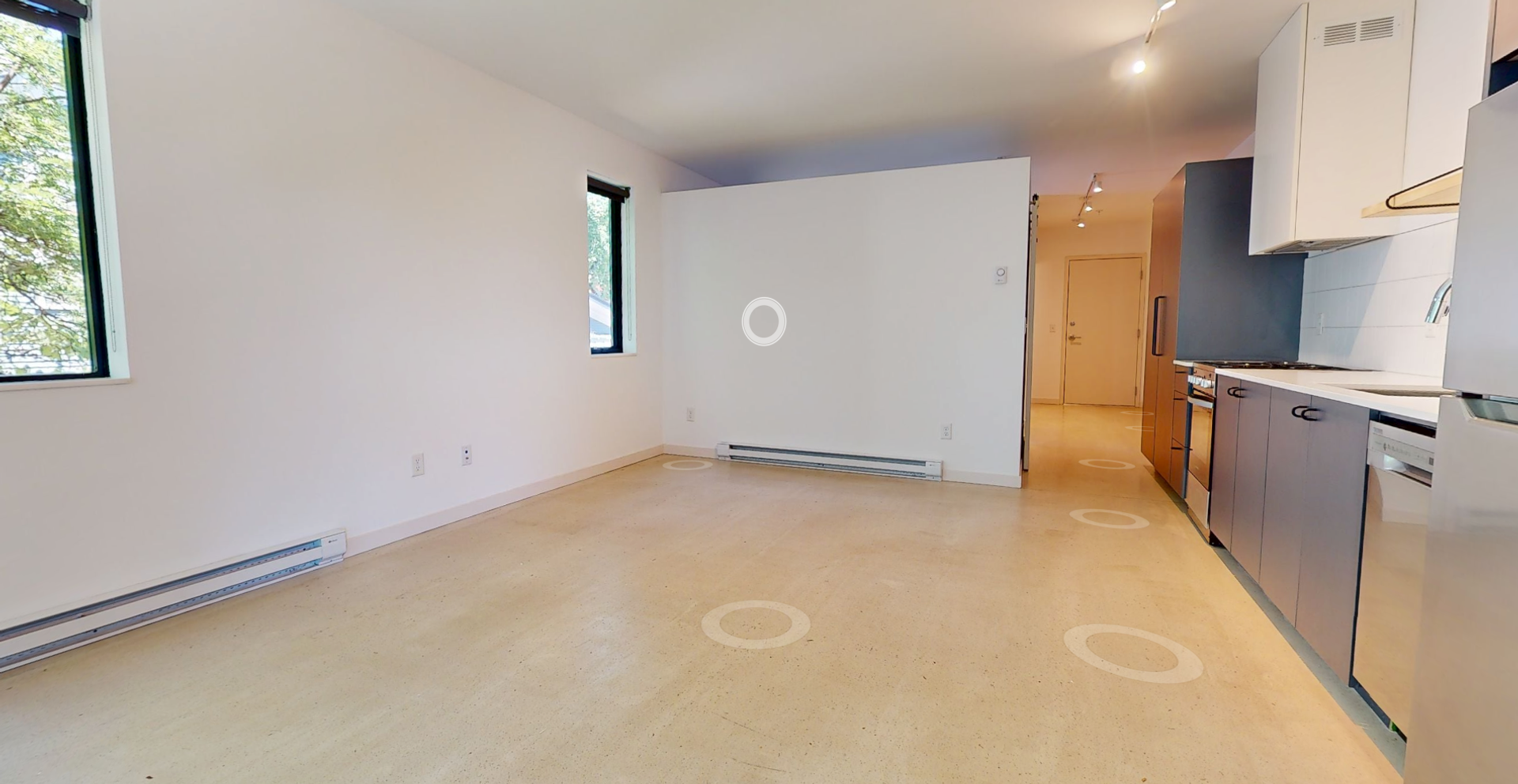 This stunning condo-style 1BR features high-end finishes, including polished concreate flooring, creating a warm and inviting ambiance. The open-concept kitchen boasts energy-efficient stainless steel appliances and sleek quartz countertops, perfect for home chefs and entertainers alike. Expansive large windows flood the space with natural light, enhancing the airy, sophisticated feel of the home.